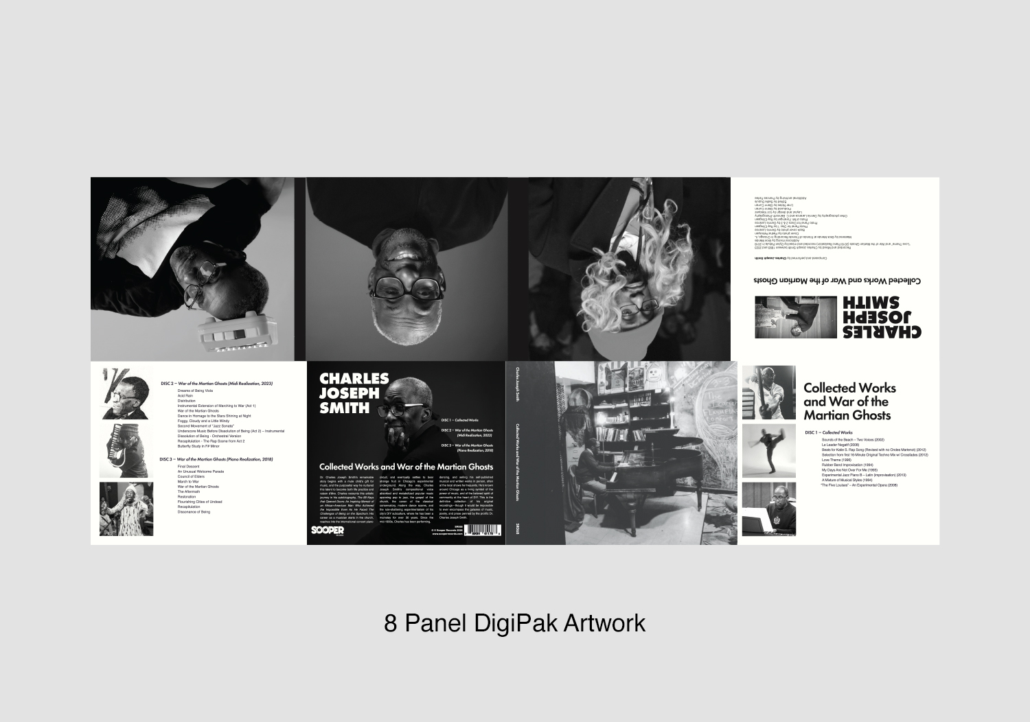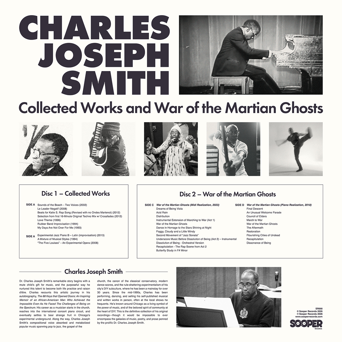 All of the music here is being made widely available for the first time. This 90-minute collection is compiled from 30 years of Charles’ self-released original music spanning concert piano, electroacoustic experimentation, electronic beats, free improvisation, and two instrumental sketches of his evolving sci-fi opera, War of the Martian Ghosts (a 2023 electronic realization, and a 2018 piano realization). This double Vinyl / Triple CD Collector’s Edition comes with an extensive Insert Booklet containing 9000 words including poetry, interviews, quotes, 30 archival photographs, and extensive liner notes on the life and work of Charles Joseph Smith written by Sooper co-founder Glenn Curran (edited by Sadie Dupuis). This is a piece of Chicago music history.